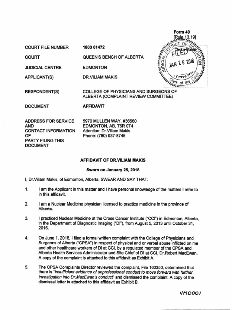 College Of Physicians And Surgeons Of Alberta Qb1803 01472 Affidavit Filed Jan 26 2018
